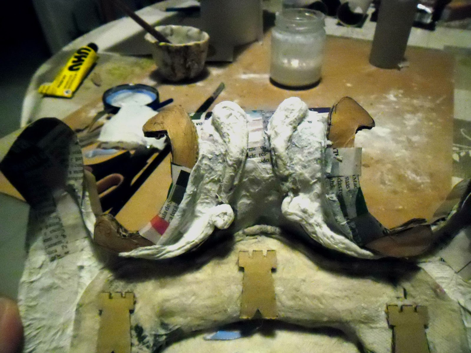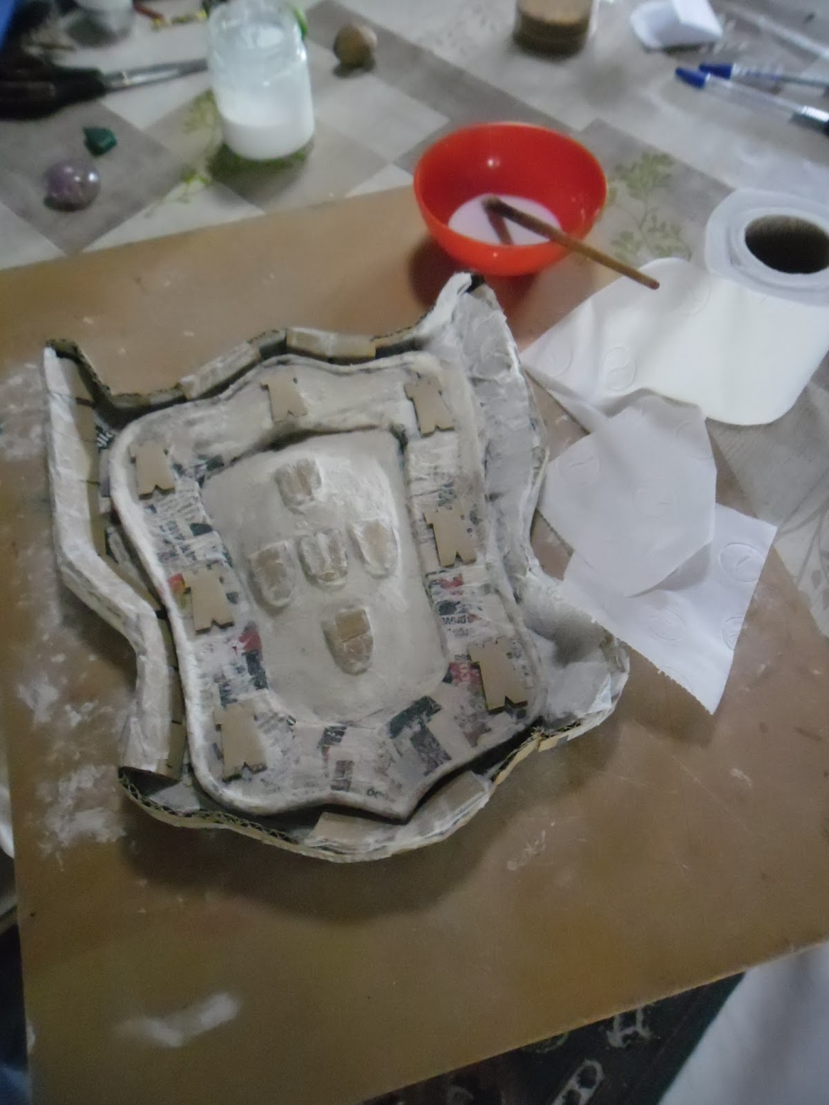 Dont have any photos of its beginings but I can tell you a little bit. I took a plaque of cardboard and cutted it according to the shape I want, then I filled its center with some cardboard left overs and modeled it with toilet paper, Also in cardboard I've designed the shields and the towers. Because the exterior is to pretend to be made from a shell I've created some "walls", covered it with paper stripes and now I'm remodeling its interior with toilet paper as its soft and, as you know, its one of my favourite moddeling pasts when soaked in glue!